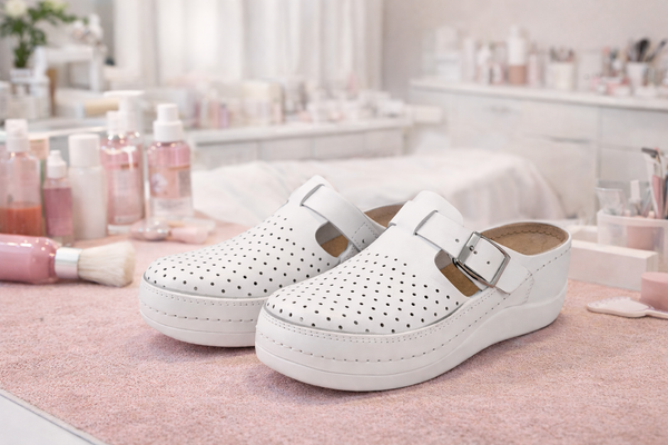 A kozmetikai munkák során gyakori a hosszú ideig tartó állás és a finom mozgás, ezért fontos a könnyű, jól szellőző papucs.
