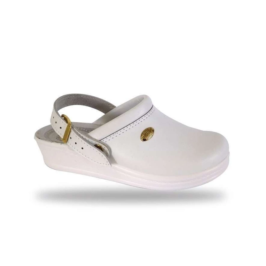 Az olaszosan letisztult design és a fedett bőr felsőrész elegáns megjelenést kölcsönöz a terméknek. A felsőrészhez kapcsolódó, csattal állítható hátsó sarokpánt segít a klumpát a lábon tartani. Ezzel egyedülálló kényelmet biztosít az egészségügyi szakemberek számára, minimalizálva a hosszú munkaidő alatt fellépő lábfáradtságot. A sarokfogó pánt nemcsak a fáradtságot csökkenti, azoknak is segít, akik a járás biztonságát szeretnék növelni és akiknek a kényelem mellett a stabilitás is fontos szempont.